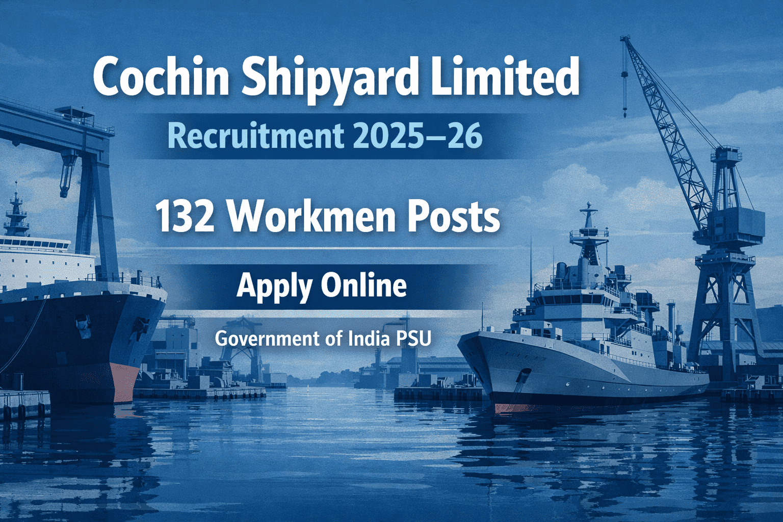 Cochin Shipyard Limited Recruitment 2025–26 has been announced by CSL. Cochin Shipyard Limited (CSL), a Mini Ratna Schedule ‘A’ Public Sector Undertaking under the Government of India, has announced a recruitment drive for the year 2025–26. Through this notification, CSL aims to fill 132 permanent Workmen category posts, offering a secure and long-term career opportunity for eligible Indian candidates.