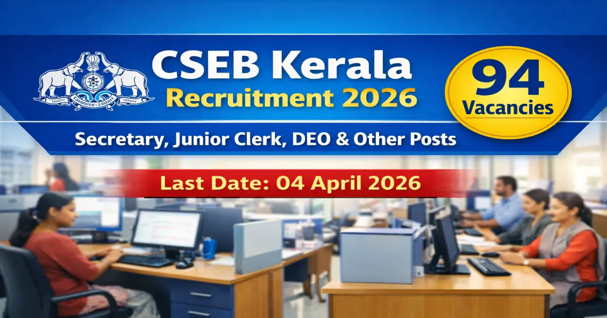 The Kerala Co-operative Service Examination Board (CSEB) has released a new employment notification for multiple posts in cooperative banks and societies across the state. The CSEB Kerala Recruitment 2026 offers a total of 94 vacancies for positions including Secretary, Assistant Secretary, Chief Accountant, Junior Clerk / Cashier, System Administrator, and Data Entry Operator.