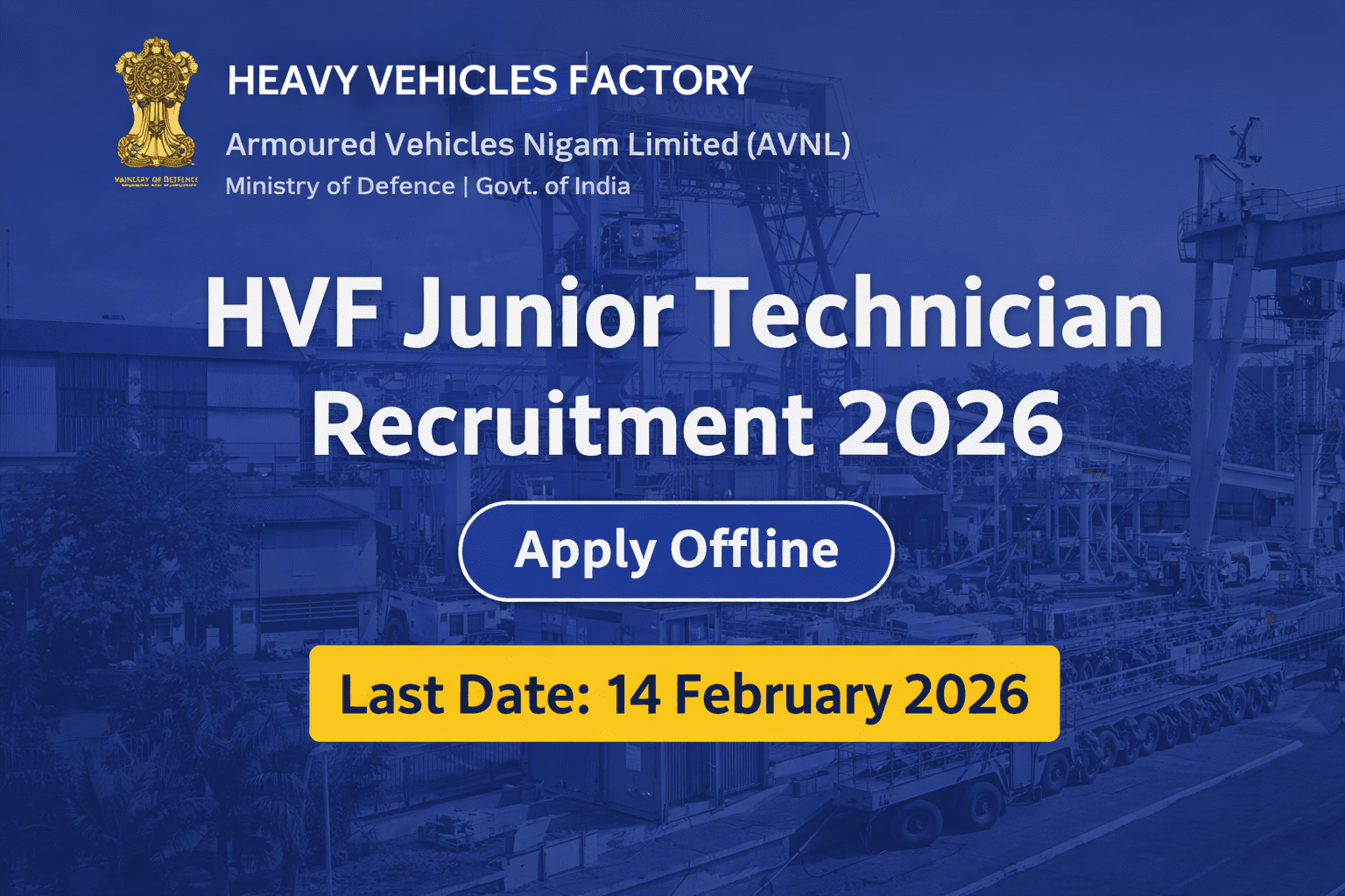 HVF Junior Technician Recruitment 2026 notification has been released by Heavy Vehicles Factory (HVF), Avadi, Chennai, under Armoured Vehicles Nigam Limited (AVNL), Ministry of Defence, Government of India.