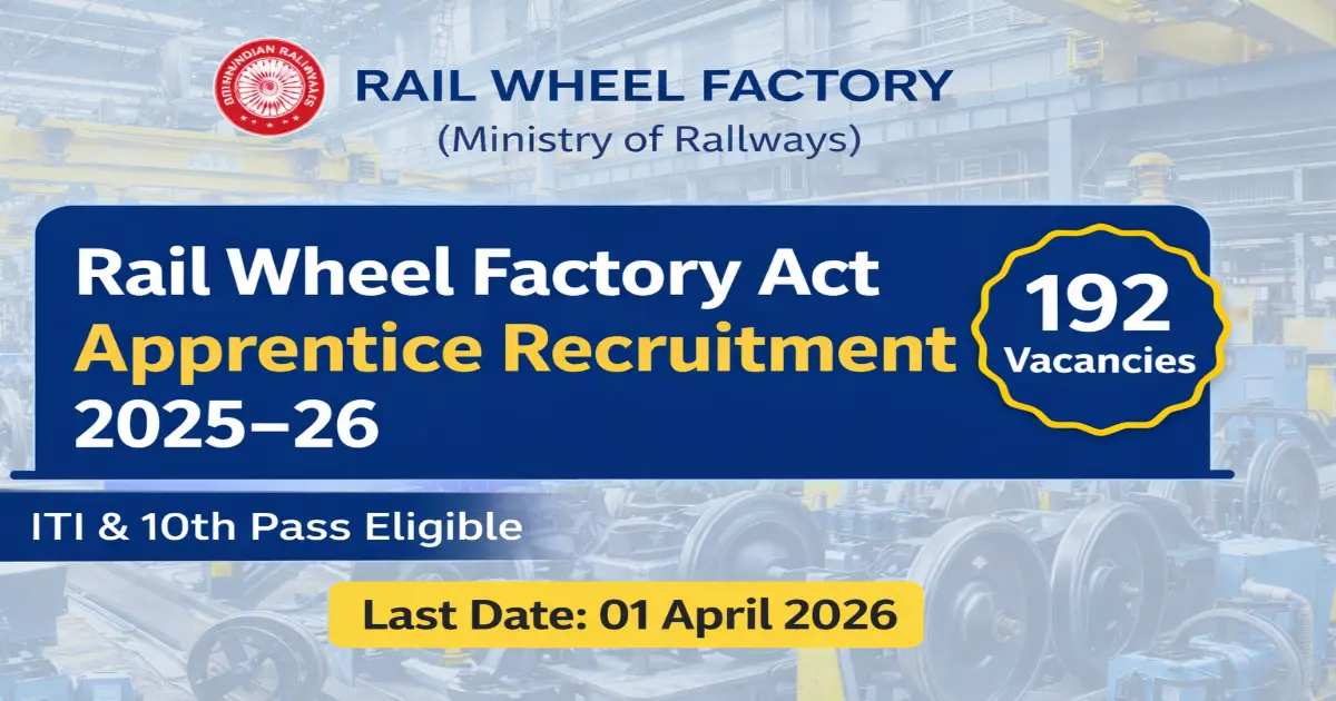 The Rail Wheel Factory Apprentice Recruitment 2025 notification has been officially released by Rail Wheel Factory (RWF), Ministry of Railways, for engagement of Act Apprentices under the Apprentices Act, 1961 for the training year 2025–26. A total of 192 vacancies have been announced across multiple designated trades.